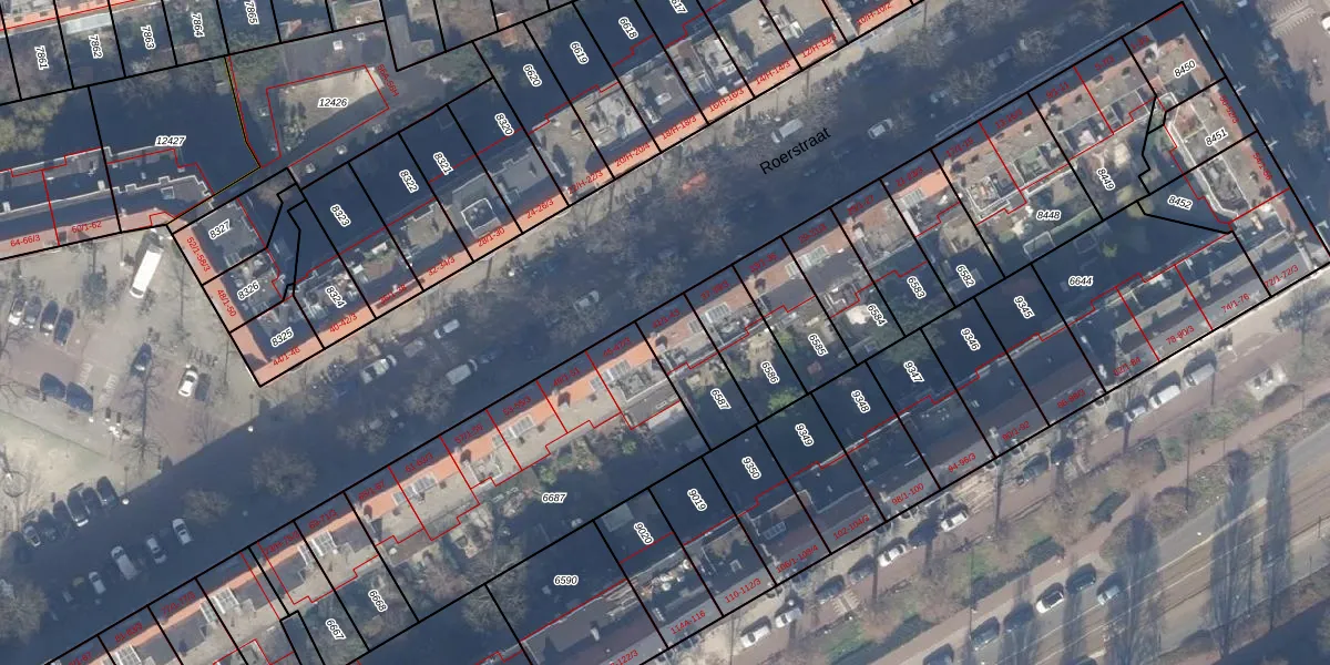Roerstraat 43 is gelegen op kadastraal perceel ASD18V6587. Deze kadastrale aanduiding is uniek en wordt gebruikt door het Kadaster om eigendomsrechten en andere zakelijke rechten vast te leggen. Het perceel maakt onderdeel uit van de kadastrale gemeente Amsterdam.