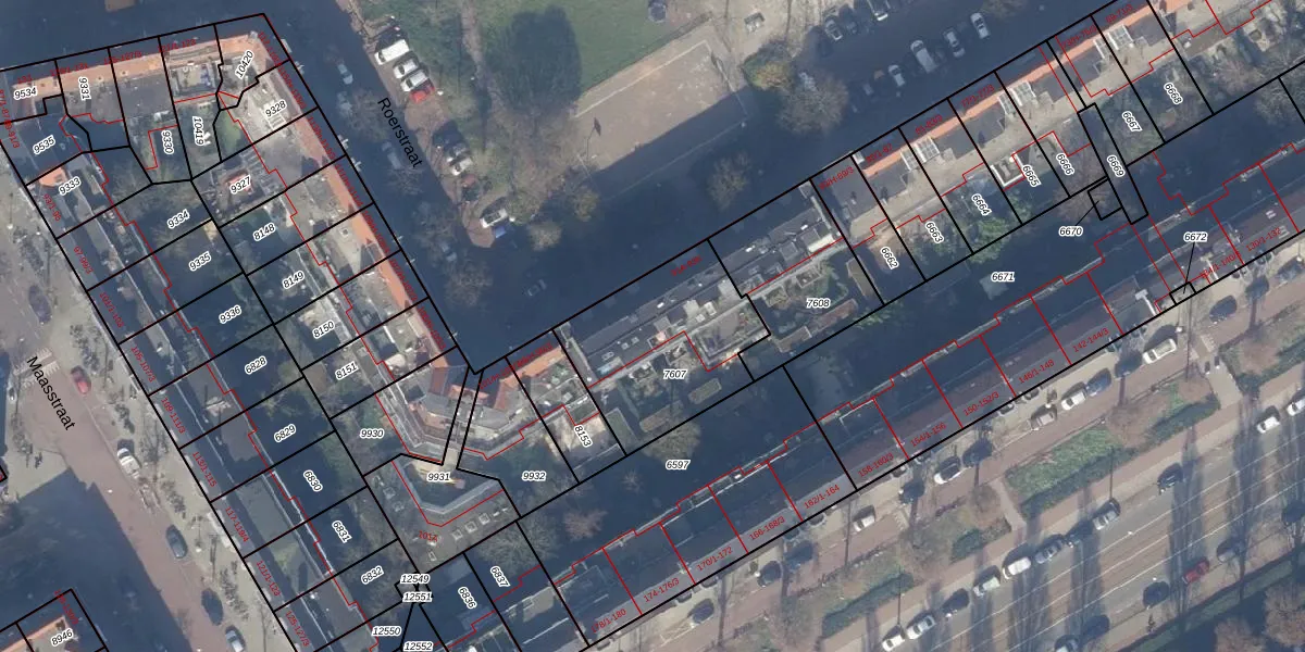 Het perceel waarop Roerstraat 93-E staat heeft een oppervlakte van 597 m². Dit is een groot perceel. De perceeloppervlakte wordt geregistreerd door het Kadaster. Gedetailleerde informatie over de maten van dit perceel kunt u vinden in het rapport Kadastrale kaart met maatvoering van Roerstraat 93-E.
