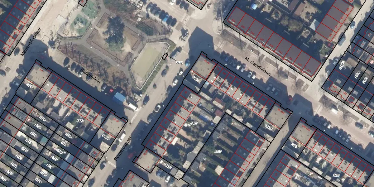 Het perceel waarop Romerostraat 35 staat heeft een oppervlakte van 1844 m². Dit is een zeer groot perceel. De perceeloppervlakte wordt geregistreerd door het Kadaster. Gedetailleerde informatie over de maten van dit perceel kunt u vinden in het rapport Kadastrale kaart met maatvoering van Romerostraat 35.