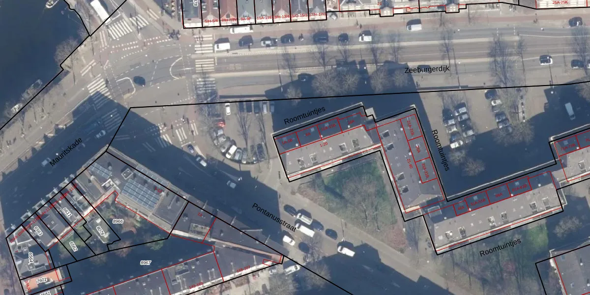 Roomtuintjes 1-B is gelegen op kadastraal perceel ASD15S8592. Deze kadastrale aanduiding is uniek en wordt gebruikt door het Kadaster om eigendomsrechten en andere zakelijke rechten vast te leggen. Het perceel maakt onderdeel uit van de kadastrale gemeente Amsterdam.