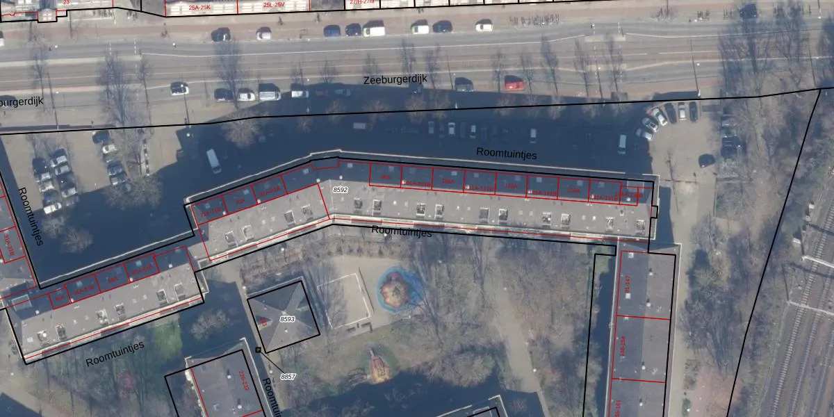 Roomtuintjes 103 is gelegen op kadastraal perceel ASD15S8592. Deze kadastrale aanduiding is uniek en wordt gebruikt door het Kadaster om eigendomsrechten en andere zakelijke rechten vast te leggen. Het perceel maakt onderdeel uit van de kadastrale gemeente Amsterdam.