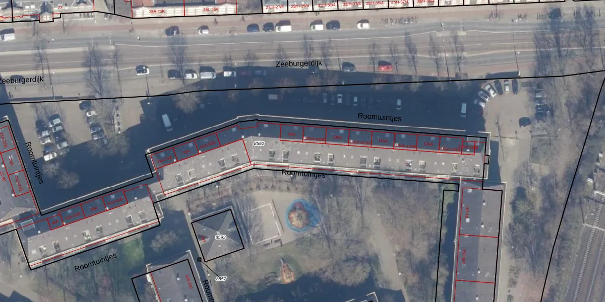 Roomtuintjes 105 is gelegen op kadastraal perceel ASD15S8592. Deze kadastrale aanduiding is uniek en wordt gebruikt door het Kadaster om eigendomsrechten en andere zakelijke rechten vast te leggen. Het perceel maakt onderdeel uit van de kadastrale gemeente Amsterdam.