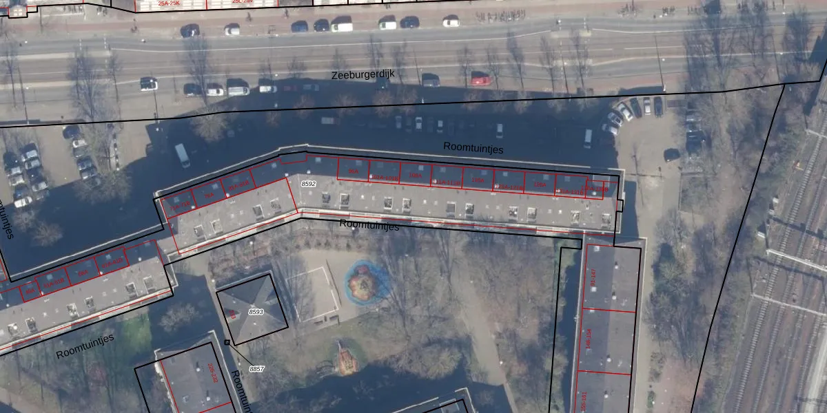 Roomtuintjes 108 is gelegen op kadastraal perceel ASD15S8592. Deze kadastrale aanduiding is uniek en wordt gebruikt door het Kadaster om eigendomsrechten en andere zakelijke rechten vast te leggen. Het perceel maakt onderdeel uit van de kadastrale gemeente Amsterdam.