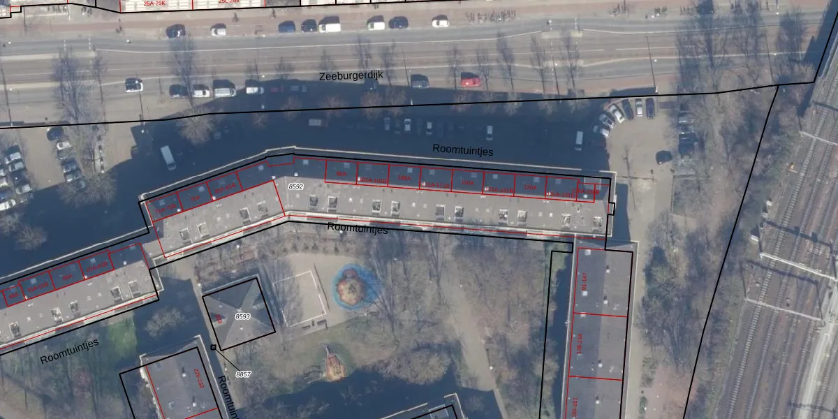 Roomtuintjes 111 is gelegen op kadastraal perceel ASD15S8592. Deze kadastrale aanduiding is uniek en wordt gebruikt door het Kadaster om eigendomsrechten en andere zakelijke rechten vast te leggen. Het perceel maakt onderdeel uit van de kadastrale gemeente Amsterdam.