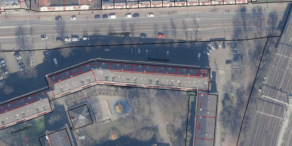 Roomtuintjes 111-B is gelegen op kadastraal perceel ASD15S8592. Deze kadastrale aanduiding is uniek en wordt gebruikt door het Kadaster om eigendomsrechten en andere zakelijke rechten vast te leggen. Het perceel maakt onderdeel uit van de kadastrale gemeente Amsterdam.