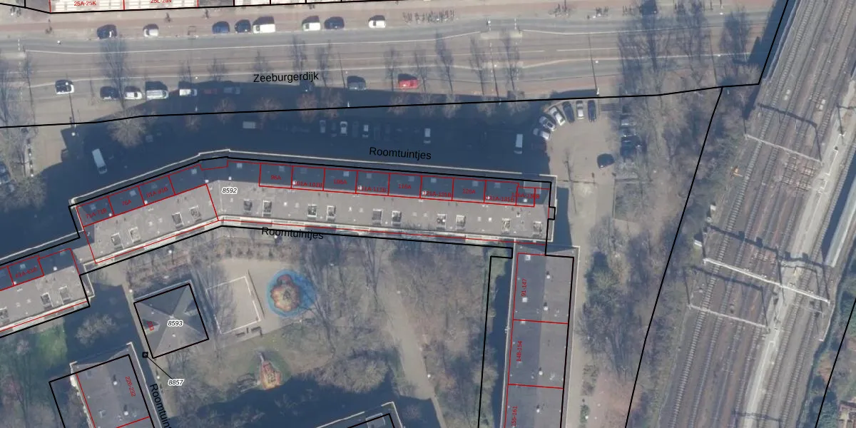 Roomtuintjes 122 is gelegen op kadastraal perceel ASD15S8592. Deze kadastrale aanduiding is uniek en wordt gebruikt door het Kadaster om eigendomsrechten en andere zakelijke rechten vast te leggen. Het perceel maakt onderdeel uit van de kadastrale gemeente Amsterdam.