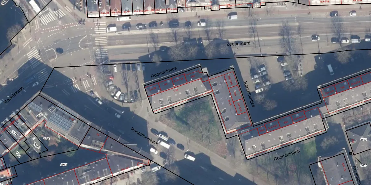 Het perceel waarop het adres ligt is ASD15-S-8592. De afkorting 'ASD15' staat voor kadastrale gemeente Amsterdam. De oppervlakte van het perceel is 4478 m². Dat is groter dan gemiddeld in Amsterdam, waar de gemiddelde perceeloppervlakte op 537,06 m² ligt. De grootste perceeloppervlakte in de kadastrale gemeente is 14,5 ha. De kleinste oppervlakte bedraagt 0 m². Er zijn 202 adressen aanwezig op het perceel. De huidige grenzen van het perceel zijn digitaal in de Basisregistratie Kadaster (BRK) geregistreerd op 09-11-2006.