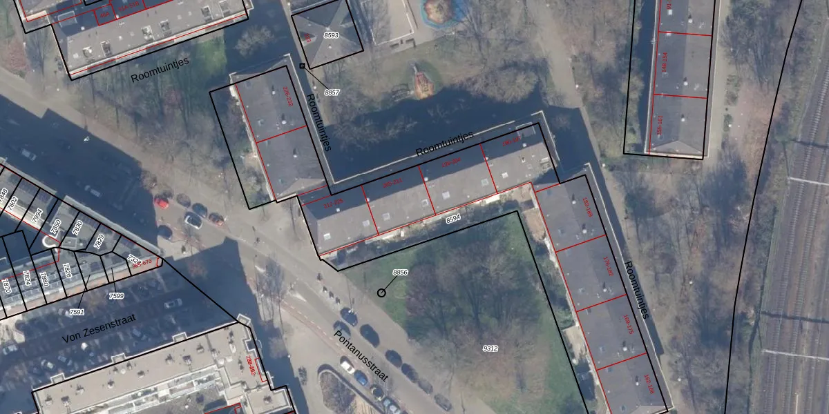 Roomtuintjes 206 is gelegen op kadastraal perceel ASD15S8594. Deze kadastrale aanduiding is uniek en wordt gebruikt door het Kadaster om eigendomsrechten en andere zakelijke rechten vast te leggen. Het perceel maakt onderdeel uit van de kadastrale gemeente Amsterdam.