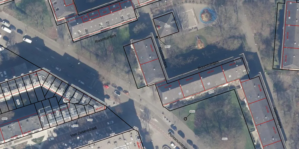 Roomtuintjes 221 is gelegen op kadastraal perceel ASD15S8594. Deze kadastrale aanduiding is uniek en wordt gebruikt door het Kadaster om eigendomsrechten en andere zakelijke rechten vast te leggen. Het perceel maakt onderdeel uit van de kadastrale gemeente Amsterdam.