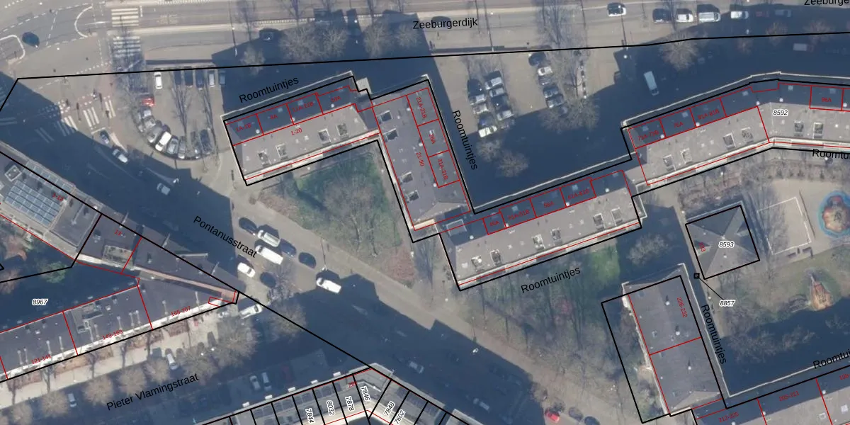 Roomtuintjes 38 is gelegen op kadastraal perceel ASD15S8592. Deze kadastrale aanduiding is uniek en wordt gebruikt door het Kadaster om eigendomsrechten en andere zakelijke rechten vast te leggen. Het perceel maakt onderdeel uit van de kadastrale gemeente Amsterdam.