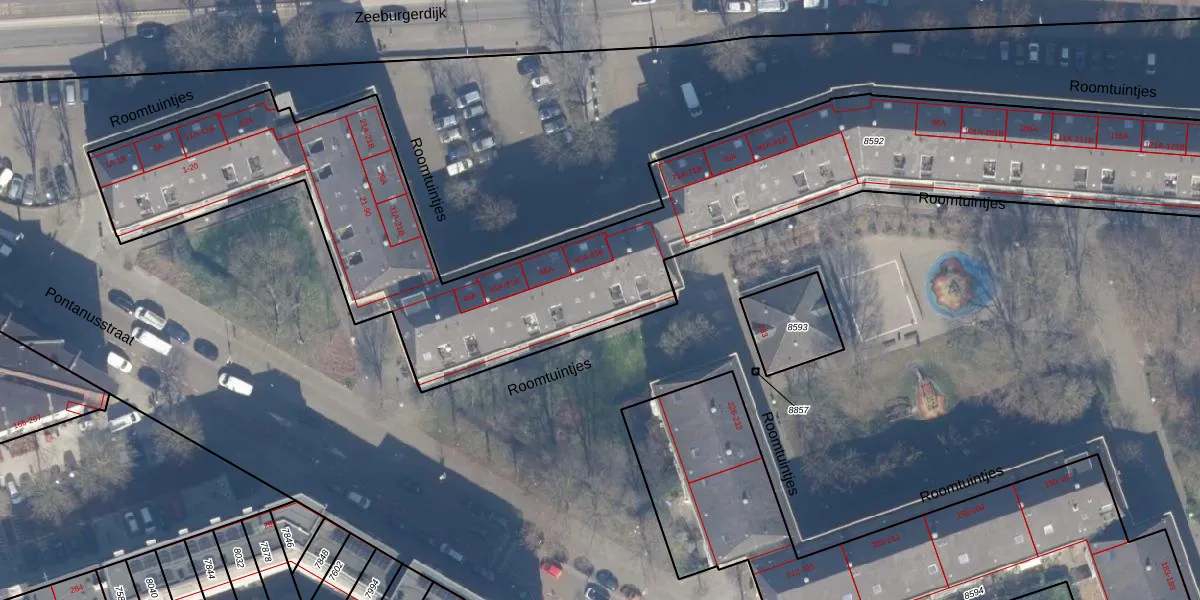 Roomtuintjes 63 is gelegen op kadastraal perceel ASD15S8592. Deze kadastrale aanduiding is uniek en wordt gebruikt door het Kadaster om eigendomsrechten en andere zakelijke rechten vast te leggen. Het perceel maakt onderdeel uit van de kadastrale gemeente Amsterdam.