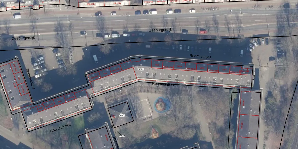 Roomtuintjes 94 is gelegen op kadastraal perceel ASD15S8592. Deze kadastrale aanduiding is uniek en wordt gebruikt door het Kadaster om eigendomsrechten en andere zakelijke rechten vast te leggen. Het perceel maakt onderdeel uit van de kadastrale gemeente Amsterdam.