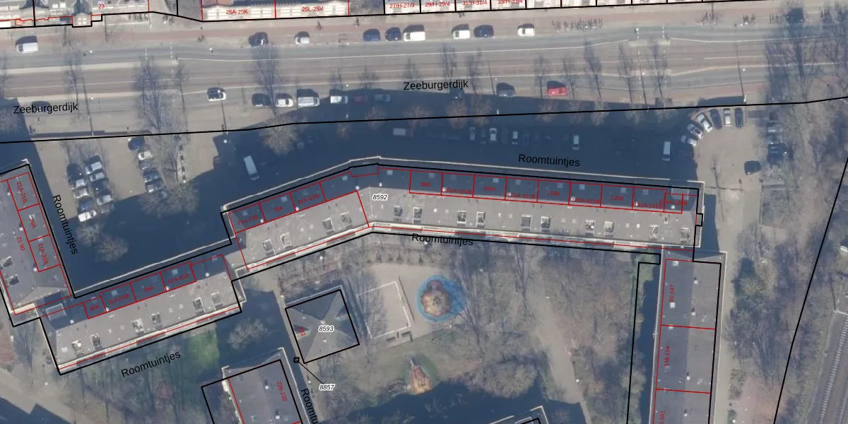 Roomtuintjes 97 is gelegen op kadastraal perceel ASD15S8592. Deze kadastrale aanduiding is uniek en wordt gebruikt door het Kadaster om eigendomsrechten en andere zakelijke rechten vast te leggen. Het perceel maakt onderdeel uit van de kadastrale gemeente Amsterdam.