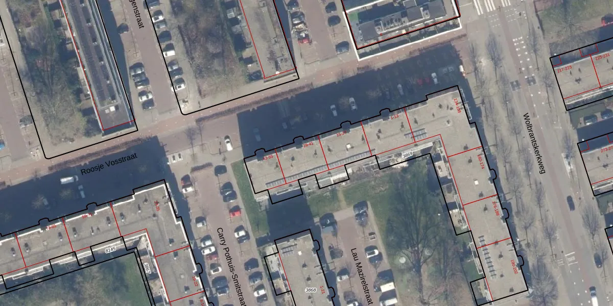 Het perceel waarop Roosje Vosstraat 39 staat heeft een oppervlakte van 2004 m². Dit is een zeer groot perceel. De perceeloppervlakte wordt geregistreerd door het Kadaster. Gedetailleerde informatie over de maten van dit perceel kunt u vinden in het rapport Kadastrale kaart met maatvoering van Roosje Vosstraat 39.