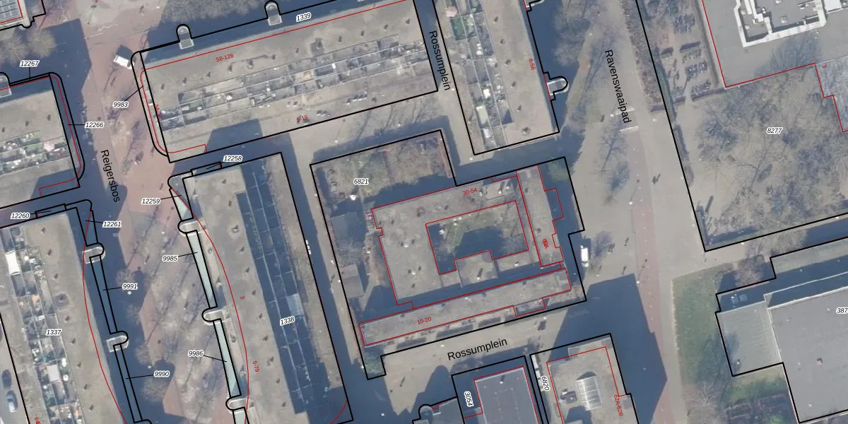 Het perceel waarop Rossumplein 34 staat heeft een oppervlakte van 2387 m². Dit is een zeer groot perceel. De perceeloppervlakte wordt geregistreerd door het Kadaster. Gedetailleerde informatie over de maten van dit perceel kunt u vinden in het rapport Kadastrale kaart met maatvoering van Rossumplein 34.