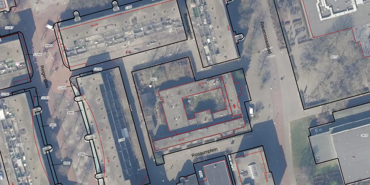 Het perceel waarop Rossumplein 36 staat heeft een oppervlakte van 2387 m². Dit is een zeer groot perceel. De perceeloppervlakte wordt geregistreerd door het Kadaster. Gedetailleerde informatie over de maten van dit perceel kunt u vinden in het rapport Kadastrale kaart met maatvoering van Rossumplein 36.