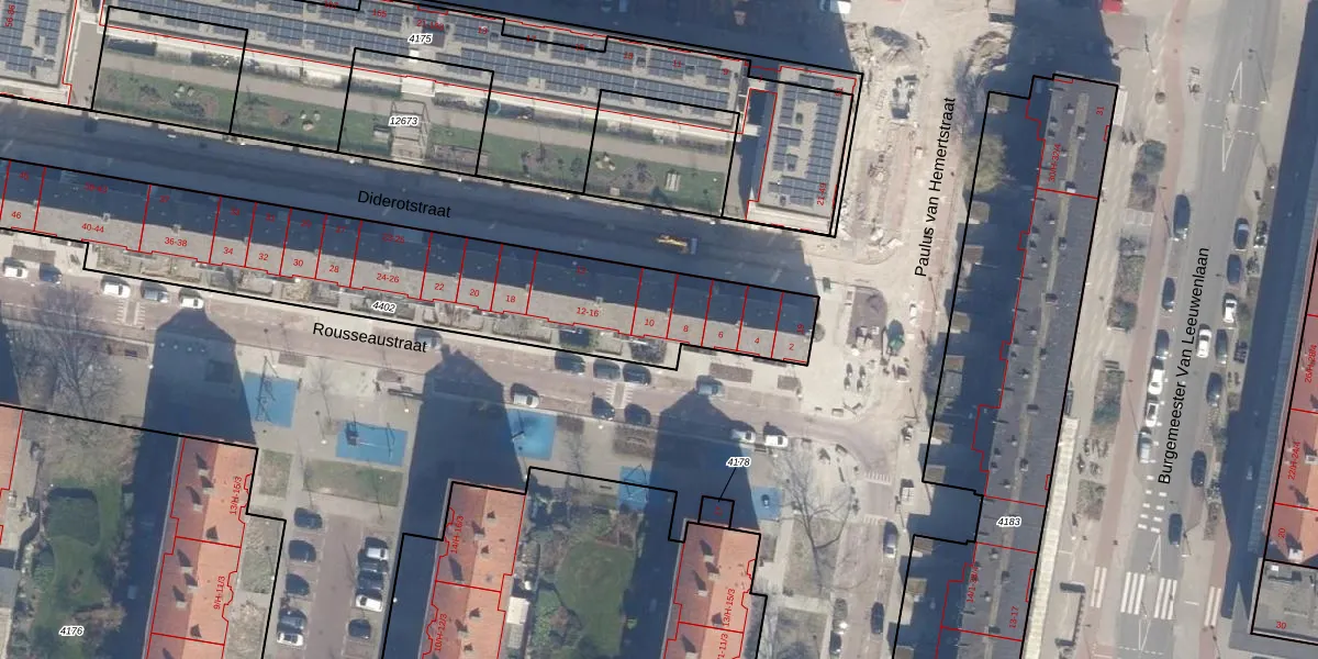 Het perceel waarop Rousseaustraat 10 staat heeft een oppervlakte van 1734 m². Dit is een zeer groot perceel. De perceeloppervlakte wordt geregistreerd door het Kadaster. Gedetailleerde informatie over de maten van dit perceel kunt u vinden in het rapport Kadastrale kaart met maatvoering van Rousseaustraat 10.