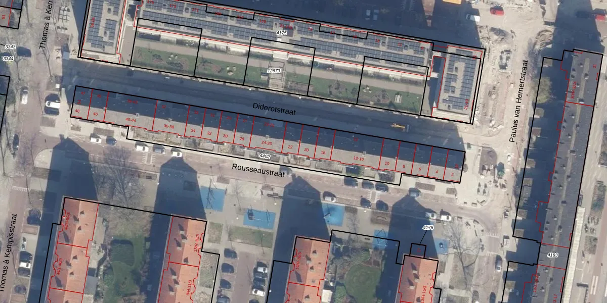 Het perceel waarop Rousseaustraat 20 staat heeft een oppervlakte van 1734 m². Dit is een zeer groot perceel. De perceeloppervlakte wordt geregistreerd door het Kadaster. Gedetailleerde informatie over de maten van dit perceel kunt u vinden in het rapport Kadastrale kaart met maatvoering van Rousseaustraat 20.