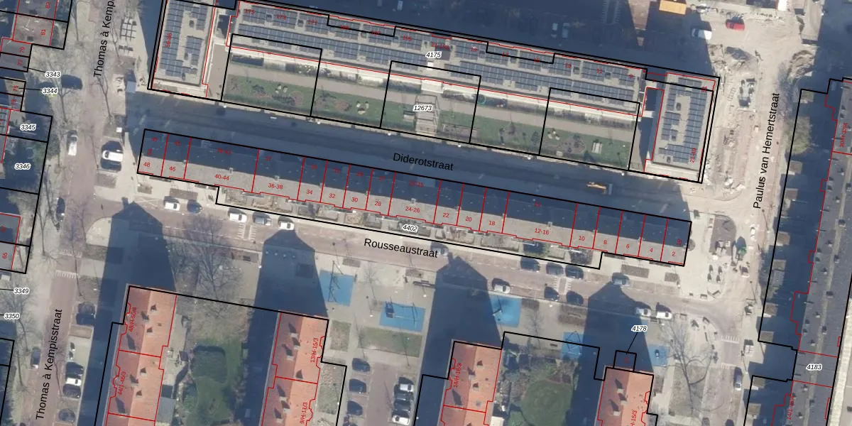 Het perceel waarop Rousseaustraat 24 staat heeft een oppervlakte van 1734 m². Dit is een zeer groot perceel. De perceeloppervlakte wordt geregistreerd door het Kadaster. Gedetailleerde informatie over de maten van dit perceel kunt u vinden in het rapport Kadastrale kaart met maatvoering van Rousseaustraat 24.