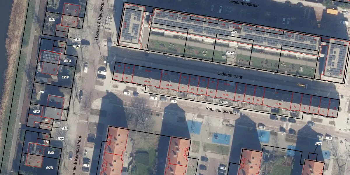 Het perceel waarop Rousseaustraat 36 staat heeft een oppervlakte van 1734 m². Dit is een zeer groot perceel. De perceeloppervlakte wordt geregistreerd door het Kadaster. Gedetailleerde informatie over de maten van dit perceel kunt u vinden in het rapport Kadastrale kaart met maatvoering van Rousseaustraat 36.