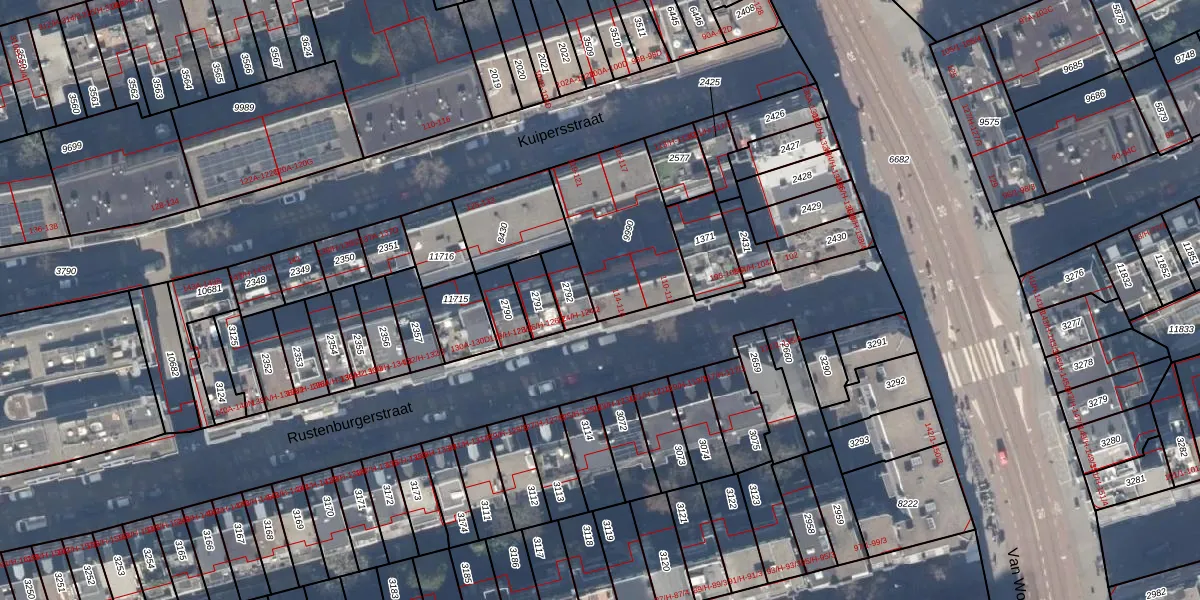 Rustenburgerstraat 116 is gelegen op kadastraal perceel ASD18V9990. Deze kadastrale aanduiding is uniek en wordt gebruikt door het Kadaster om eigendomsrechten en andere zakelijke rechten vast te leggen. Het perceel maakt onderdeel uit van de kadastrale gemeente Amsterdam.