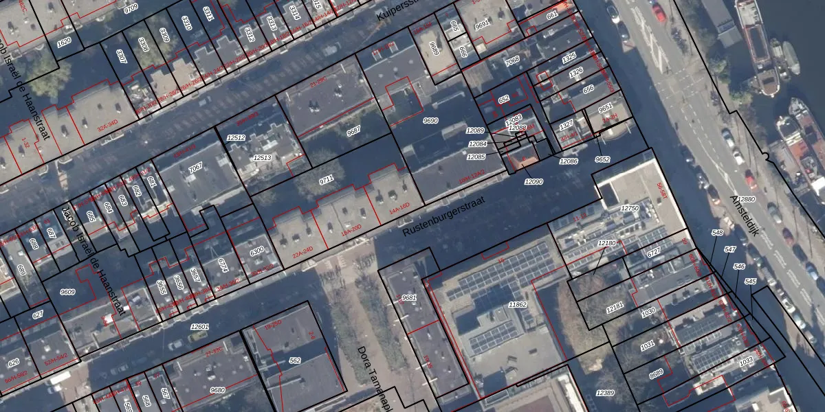 Rustenburgerstraat 14-A is gelegen op kadastraal perceel ASD18V9711. Deze kadastrale aanduiding is uniek en wordt gebruikt door het Kadaster om eigendomsrechten en andere zakelijke rechten vast te leggen. Het perceel maakt onderdeel uit van de kadastrale gemeente Amsterdam.