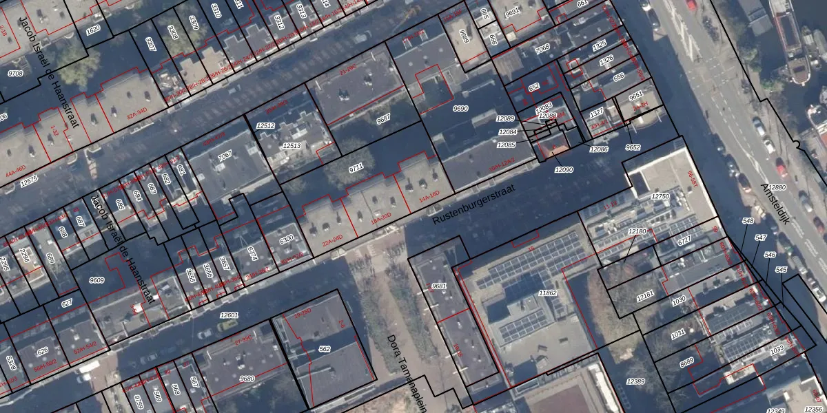 Rustenburgerstraat 16-B is gelegen op kadastraal perceel ASD18V9711. Deze kadastrale aanduiding is uniek en wordt gebruikt door het Kadaster om eigendomsrechten en andere zakelijke rechten vast te leggen. Het perceel maakt onderdeel uit van de kadastrale gemeente Amsterdam.