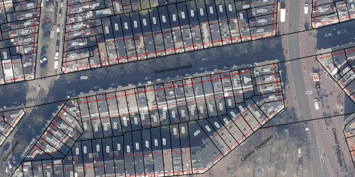 Rustenburgerstraat 405-3 is gelegen op kadastraal perceel ASD18V2588. Deze kadastrale aanduiding is uniek en wordt gebruikt door het Kadaster om eigendomsrechten en andere zakelijke rechten vast te leggen. Het perceel maakt onderdeel uit van de kadastrale gemeente Amsterdam.