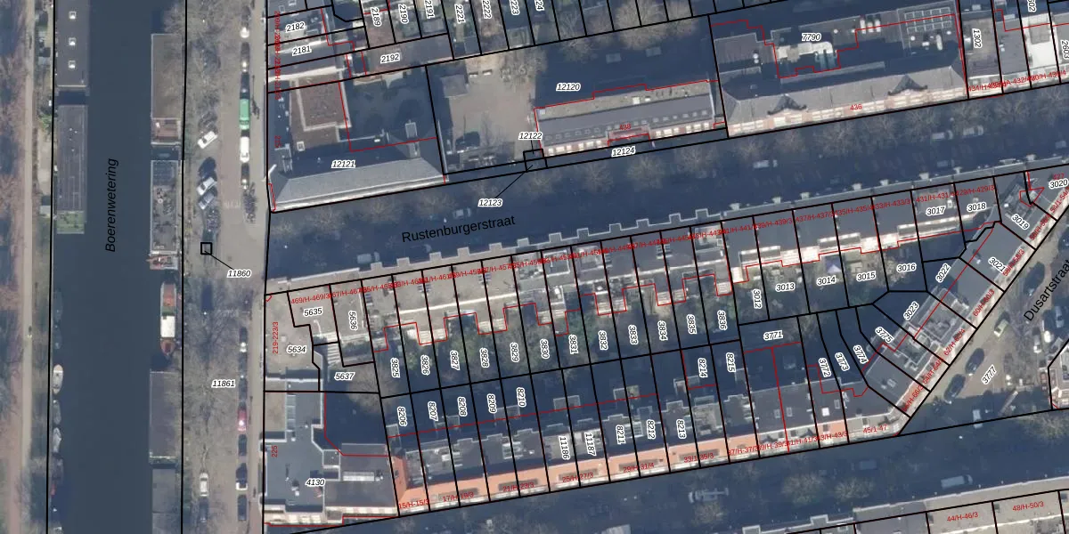 Rustenburgerstraat 455-3 is gelegen op kadastraal perceel ASD18V3830. Deze kadastrale aanduiding is uniek en wordt gebruikt door het Kadaster om eigendomsrechten en andere zakelijke rechten vast te leggen. Het perceel maakt onderdeel uit van de kadastrale gemeente Amsterdam.