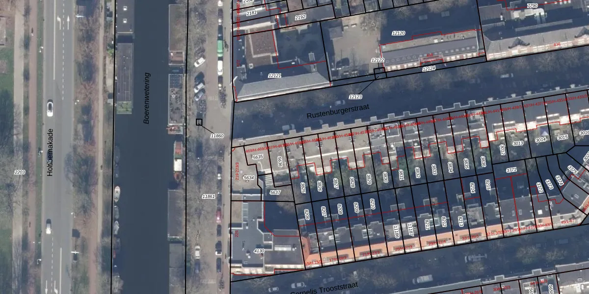 Het perceel waarop het adres ligt is ASD18-V-3825. De afkorting 'ASD18' staat voor kadastrale gemeente Amsterdam. De gemiddelde perceelgrootte in Amsterdam is 559,23 m². Dit perceel is kleiner: de perceeloppervlakte bedraagt 132 m². Het kleinste perceel in de kadastrale gemeente is 0 m² groot. De grootste perceeloppervlakte is 12,5 ha. Op het perceel zijn 4 adressen aanwezig. In de Basisregistratie Kadaster (BRK) werden de grenzen van het perceel geregistreerd op 20-09-2006.