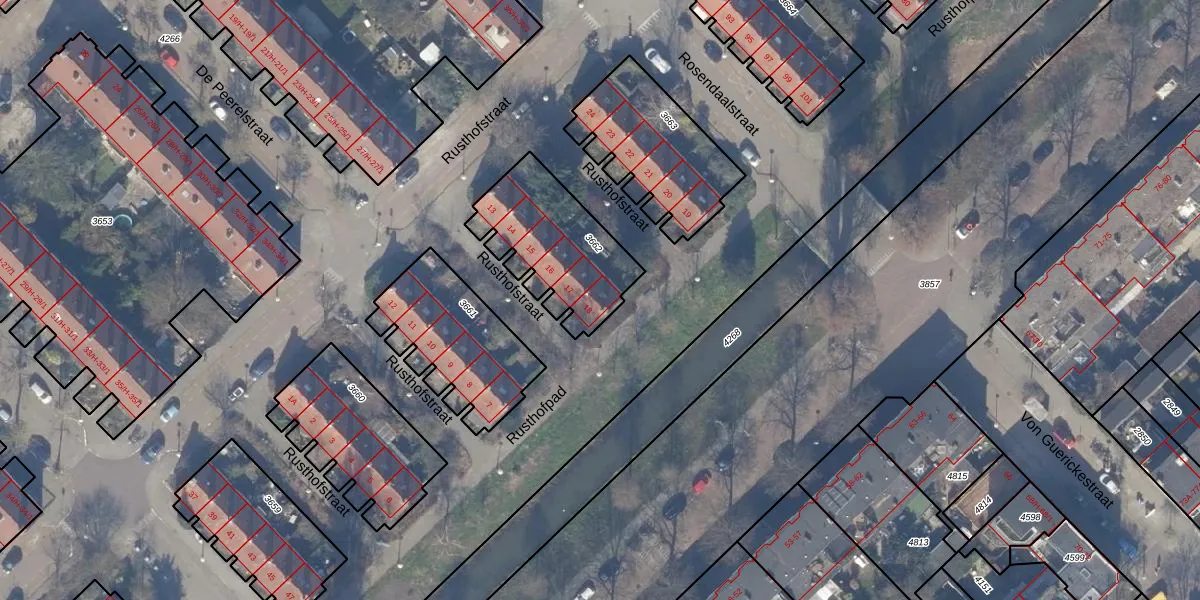 Het perceel waarop Rusthofstraat 18 staat heeft een oppervlakte van 439 m². Dit is een groot perceel. De perceeloppervlakte wordt geregistreerd door het Kadaster. Gedetailleerde informatie over de maten van dit perceel kunt u vinden in het rapport Kadastrale kaart met maatvoering van Rusthofstraat 18.