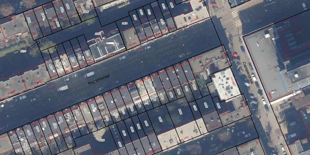 Het perceel waarop Ruyschstraat 102-H staat heeft een oppervlakte van 119 m². Dit is een middelgroot perceel. De perceeloppervlakte wordt geregistreerd door het Kadaster. Gedetailleerde informatie over de maten van dit perceel kunt u vinden in het rapport Kadastrale kaart met maatvoering van Ruyschstraat 102-H.