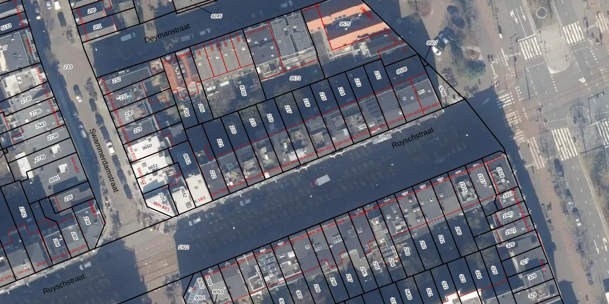 Het adres is gelegen op perceel 217 in de sectie S en de kadastrale gemeente Amsterdam. De kadastrale aanduiding is aldus ASD15-S-217. Het perceel is kleiner dan gemiddeld in Amsterdam. Het perceel is 152 m² groot, terwijl het gemiddelde ligt op 537,06 m². Het kleinste perceel in de kadastrale gemeente is 0 m² groot. De grootste perceeloppervlakte is 14,5 ha. Op het perceel zijn 3 adressen aanwezig. In de Basisregistratie Kadaster (BRK) werden de grenzen van het perceel geregistreerd op 30-11-2006.