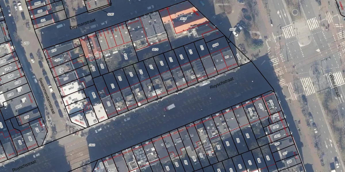 Ruyschstraat 33-H is gelegen op kadastraal perceel ASD15S216. Deze kadastrale aanduiding is uniek en wordt gebruikt door het Kadaster om eigendomsrechten en andere zakelijke rechten vast te leggen. Het perceel maakt onderdeel uit van de kadastrale gemeente Amsterdam.