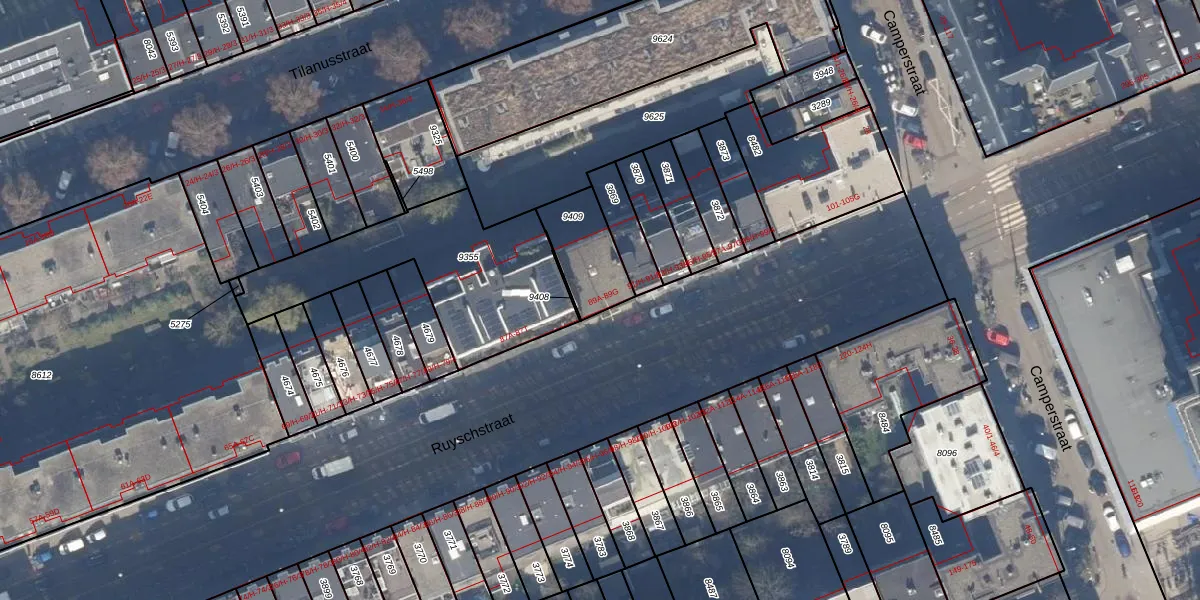 Het perceel waarop Ruyschstraat 89-E staat heeft een oppervlakte van 195 m². Dit is een middelgroot perceel. De perceeloppervlakte wordt geregistreerd door het Kadaster. Gedetailleerde informatie over de maten van dit perceel kunt u vinden in het rapport Kadastrale kaart met maatvoering van Ruyschstraat 89-E.