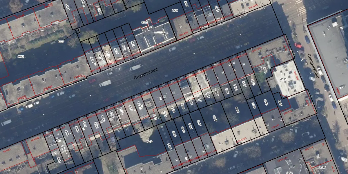 Het perceel waarop Ruyschstraat 94-3 staat heeft een oppervlakte van 119 m². Dit is een middelgroot perceel. De perceeloppervlakte wordt geregistreerd door het Kadaster. Gedetailleerde informatie over de maten van dit perceel kunt u vinden in het rapport Kadastrale kaart met maatvoering van Ruyschstraat 94-3.