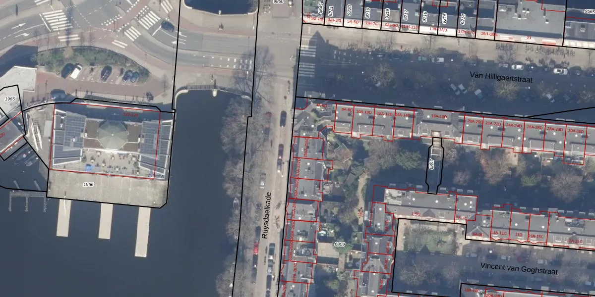 Het perceel waarop Ruysdaelkade 255-C staat heeft een oppervlakte van 1,2 ha. Dit is een zeer groot perceel. De perceeloppervlakte wordt geregistreerd door het Kadaster. Gedetailleerde informatie over de maten van dit perceel kunt u vinden in het rapport Kadastrale kaart met maatvoering van Ruysdaelkade 255-C.