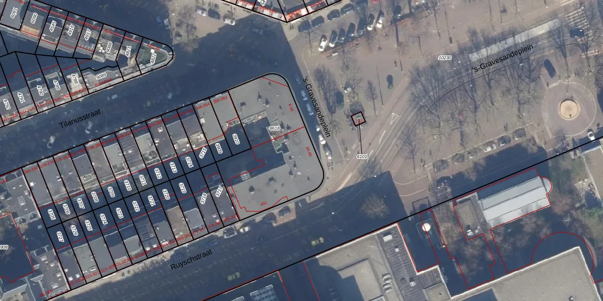Het perceel waarop 's-Gravesandeplein 54 staat heeft een oppervlakte van 1050 m². Dit is een zeer groot perceel. De perceeloppervlakte wordt geregistreerd door het Kadaster. Gedetailleerde informatie over de maten van dit perceel kunt u vinden in het rapport Kadastrale kaart met maatvoering van 's-Gravesandeplein 54.