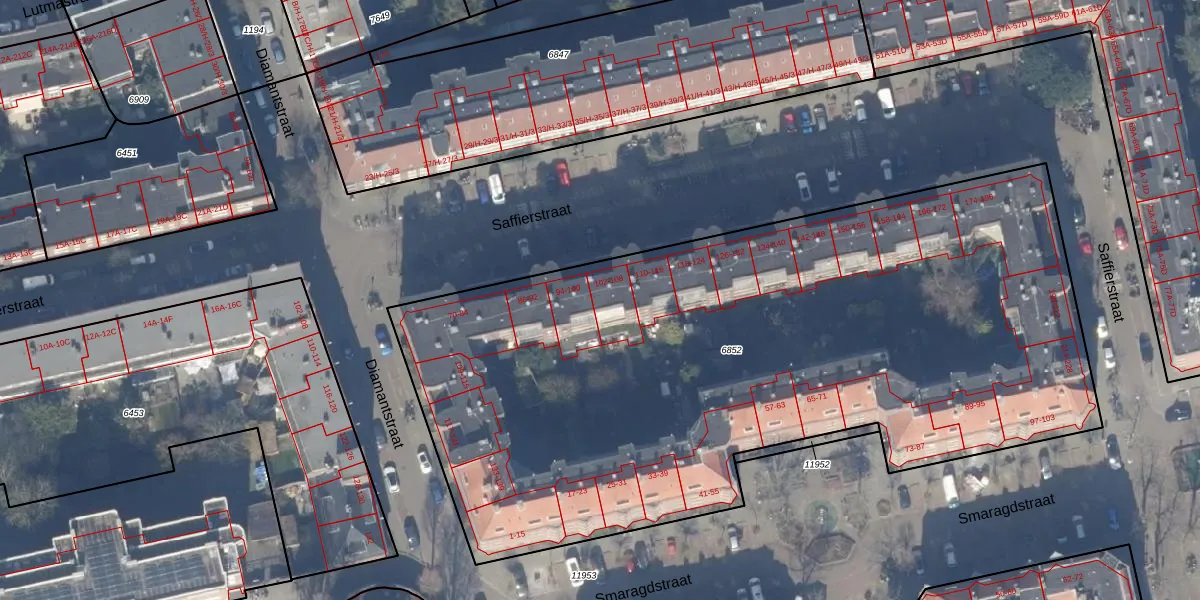 Saffierstraat 102 is gelegen op kadastraal perceel ASD18V6852. Deze kadastrale aanduiding is uniek en wordt gebruikt door het Kadaster om eigendomsrechten en andere zakelijke rechten vast te leggen. Het perceel maakt onderdeel uit van de kadastrale gemeente Amsterdam.