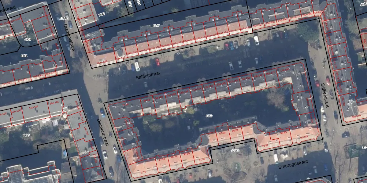 Saffierstraat 112 is gelegen op kadastraal perceel ASD18V6852. Deze kadastrale aanduiding is uniek en wordt gebruikt door het Kadaster om eigendomsrechten en andere zakelijke rechten vast te leggen. Het perceel maakt onderdeel uit van de kadastrale gemeente Amsterdam.