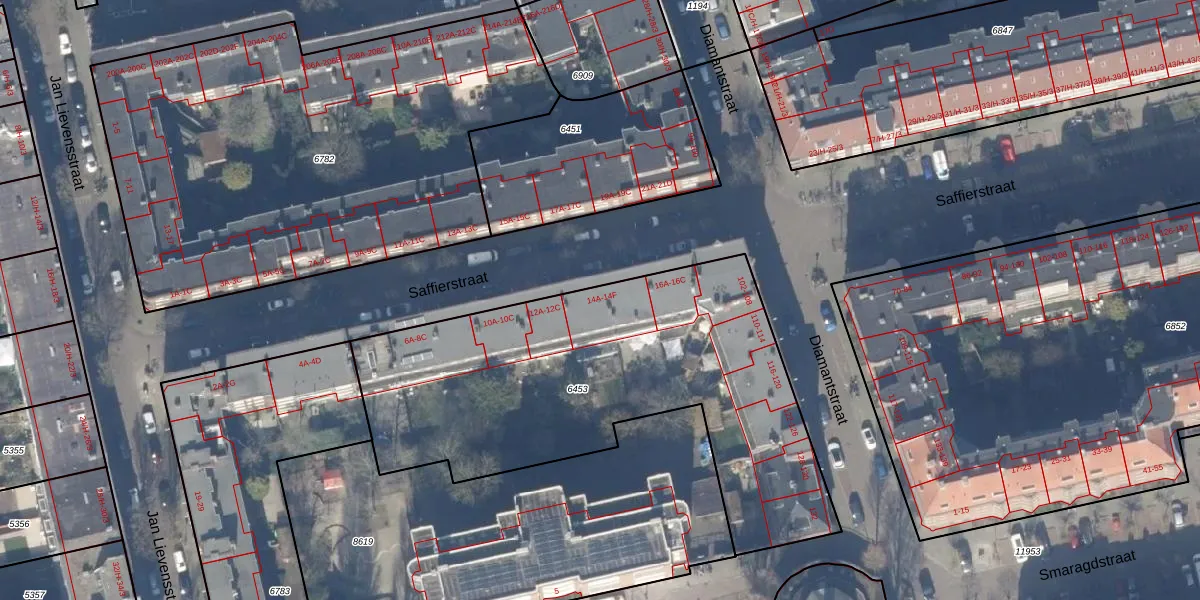 Saffierstraat 14-B is gelegen op kadastraal perceel ASD18V6453. Deze kadastrale aanduiding is uniek en wordt gebruikt door het Kadaster om eigendomsrechten en andere zakelijke rechten vast te leggen. Het perceel maakt onderdeel uit van de kadastrale gemeente Amsterdam.