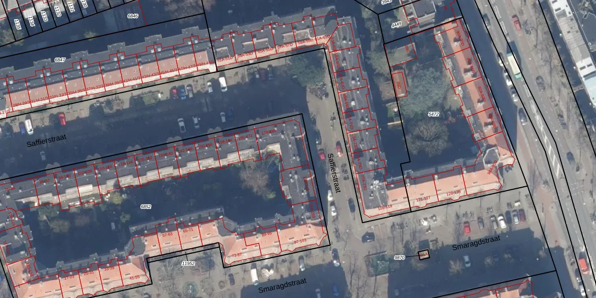 Saffierstraat 184 is gelegen op kadastraal perceel ASD18V6852. Deze kadastrale aanduiding is uniek en wordt gebruikt door het Kadaster om eigendomsrechten en andere zakelijke rechten vast te leggen. Het perceel maakt onderdeel uit van de kadastrale gemeente Amsterdam.