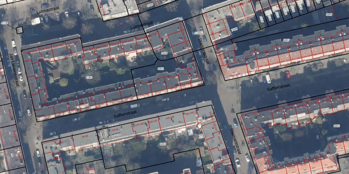 Het adres is gelegen op perceel 6451 in de sectie V en de kadastrale gemeente Amsterdam. De kadastrale aanduiding is aldus ASD18-V-6451. De gemiddelde perceeloppervlakte in de kadastrale gemeente Amsterdam is 559,23 m². Dit perceel is met zijn 716 m² dus groter dan gemiddeld. De grootste perceeloppervlakte in de kadastrale gemeente is 12,5 ha. De kleinste oppervlakte bedraagt 0 m². Op het perceel zijn 20 adressen aanwezig. De huidige grenzen van het perceel zijn digitaal in de Basisregistratie Kadaster (BRK) geregistreerd op 17-10-2006.