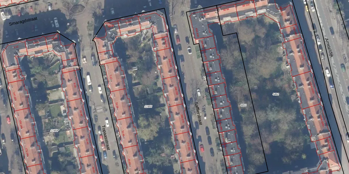 Saffierstraat 250 is gelegen op kadastraal perceel ASD18V11955. Deze kadastrale aanduiding is uniek en wordt gebruikt door het Kadaster om eigendomsrechten en andere zakelijke rechten vast te leggen. Het perceel maakt onderdeel uit van de kadastrale gemeente Amsterdam.