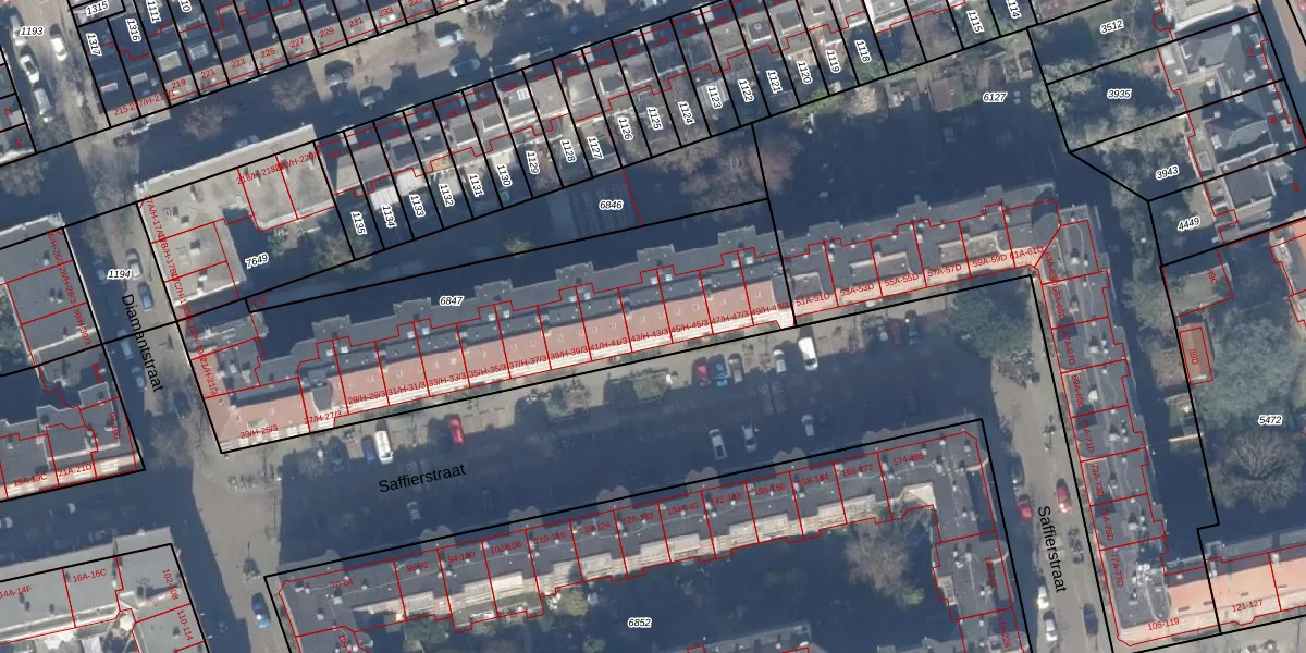 Saffierstraat 43-3 is gelegen op kadastraal perceel ASD18V6847. Deze kadastrale aanduiding is uniek en wordt gebruikt door het Kadaster om eigendomsrechten en andere zakelijke rechten vast te leggen. Het perceel maakt onderdeel uit van de kadastrale gemeente Amsterdam.