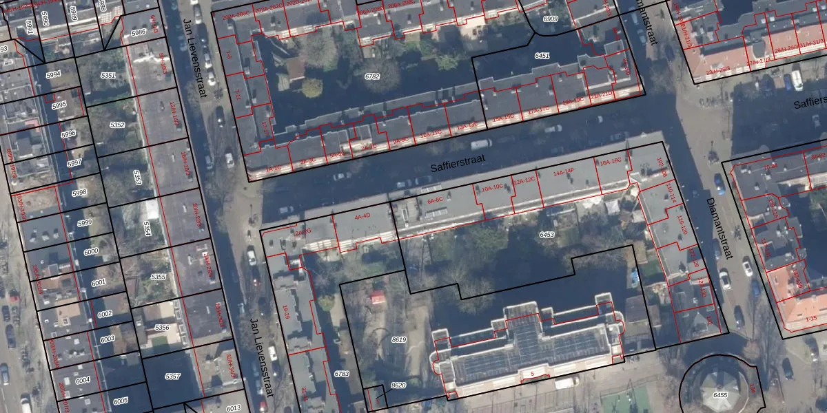 Saffierstraat 6-B is gelegen op kadastraal perceel ASD18V6453. Deze kadastrale aanduiding is uniek en wordt gebruikt door het Kadaster om eigendomsrechten en andere zakelijke rechten vast te leggen. Het perceel maakt onderdeel uit van de kadastrale gemeente Amsterdam.