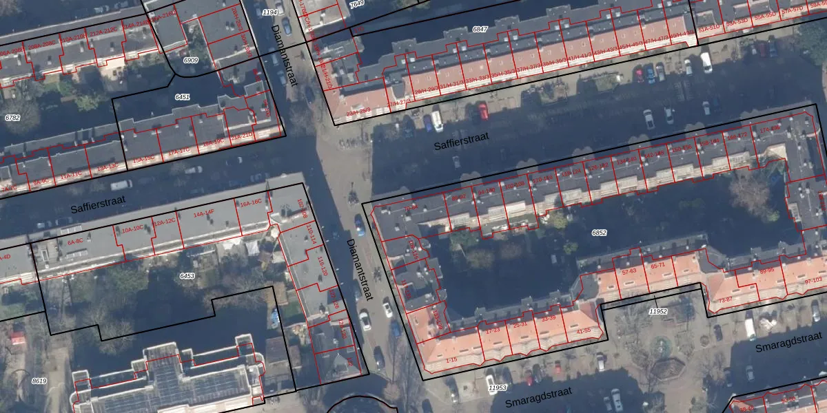 Saffierstraat 82 is gelegen op kadastraal perceel ASD18V6852. Deze kadastrale aanduiding is uniek en wordt gebruikt door het Kadaster om eigendomsrechten en andere zakelijke rechten vast te leggen. Het perceel maakt onderdeel uit van de kadastrale gemeente Amsterdam.
