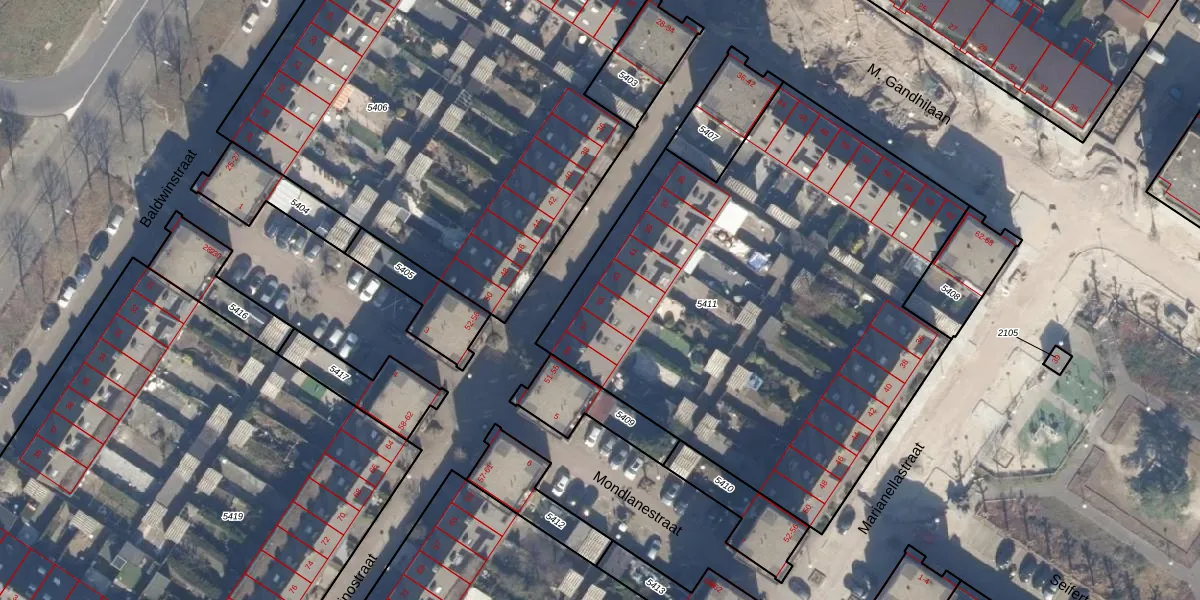 Het perceel waarop Sandinostraat 45 staat heeft een oppervlakte van 2984 m². Dit is een zeer groot perceel. De perceeloppervlakte wordt geregistreerd door het Kadaster. Gedetailleerde informatie over de maten van dit perceel kunt u vinden in het rapport Kadastrale kaart met maatvoering van Sandinostraat 45.