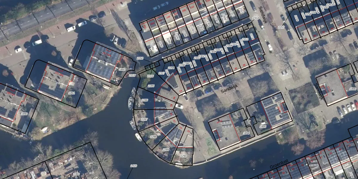 Sandwijk 54 is gelegen op kadastraal perceel ASD33AN2284. Deze kadastrale aanduiding is uniek en wordt gebruikt door het Kadaster om eigendomsrechten en andere zakelijke rechten vast te leggen. Het perceel maakt onderdeel uit van de kadastrale gemeente Amsterdam.
