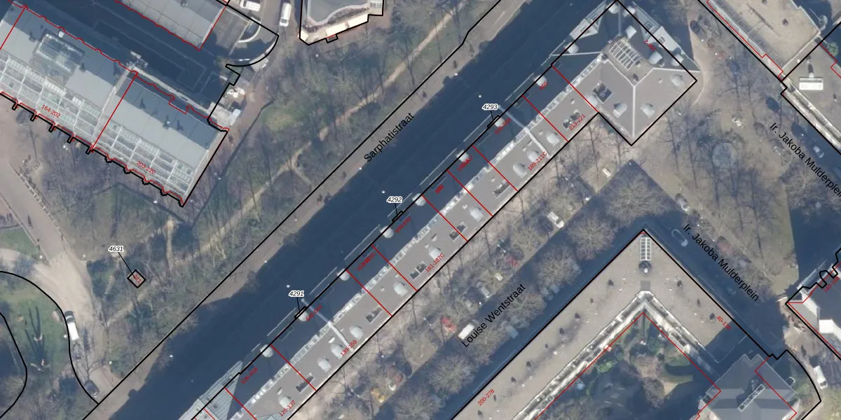 Het perceel waarop Sarphatistraat 650 staat heeft een oppervlakte van 4914 m². Dit is een zeer groot perceel. De perceeloppervlakte wordt geregistreerd door het Kadaster. Gedetailleerde informatie over de maten van dit perceel kunt u vinden in het rapport Kadastrale kaart met maatvoering van Sarphatistraat 650.